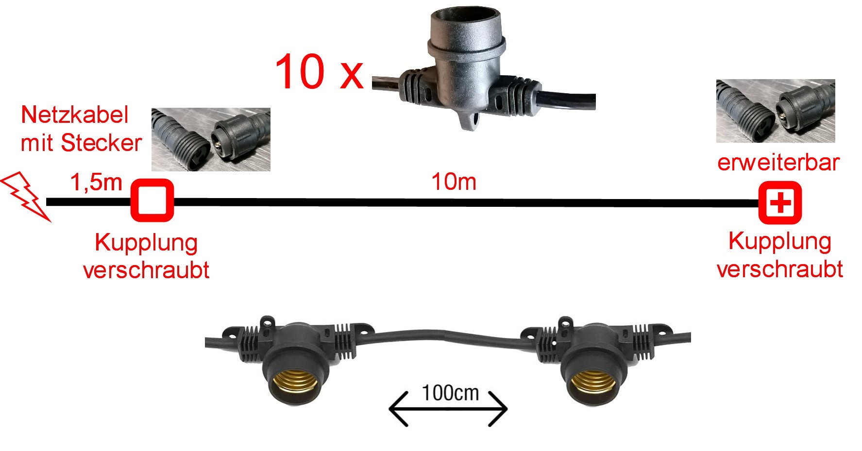 Jede Einheit wird mit 1.5m Zuleitung (mit T12 Netzstecker) sowie 10m Girlande (ohne Leuchtmittel) geliefert. Um die Girlande zu erweitern, kann die Zuleitung abgeschraubt werden und die nächste Girlande direkt verbunden werden. Schnell, sauber, robust!